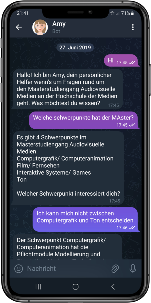 - Amy: Simpler Frage-Antwort-Chatbot, der von uns entwickelt wurde.